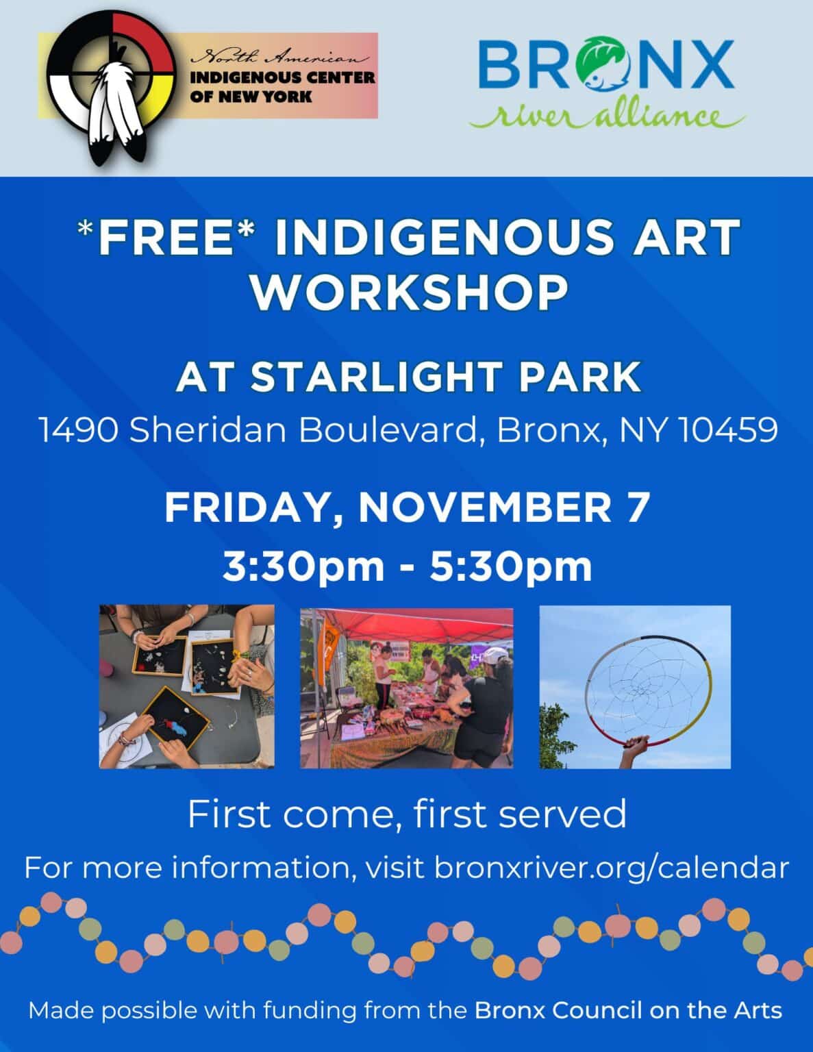 Join the the North American Indigenous Center of New York and the Bronx River Alliance for an Indigenous Art Workshop in Concrete Plant Park from 12-4pm on